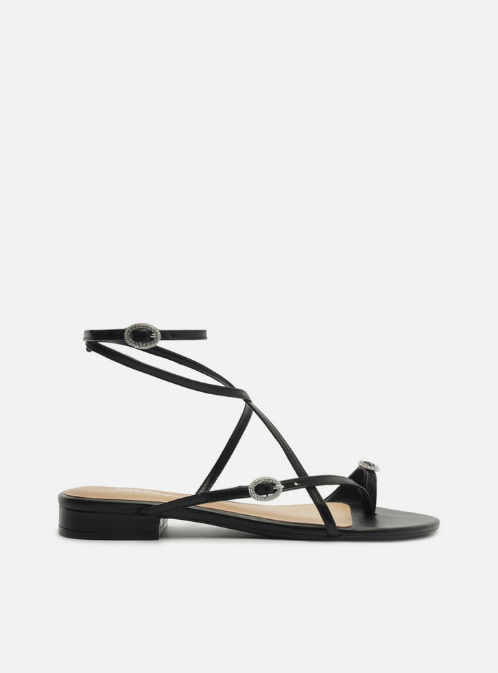 Sandália feminina preta de couro. O sapato tem salto mínimo bloco e formato arredondado na ponta. Traz tira dedeira com fivela arredondada cravejada de cristais e tiras finas que cruzam a parte superior do pé, sendo uma delas com fivela lateral igualmente cravejada. Outras duas tiras contornam o tornozelo e fecham em fivela cravejada lateral. Com palmilha bege e inscrição do nome da marca.