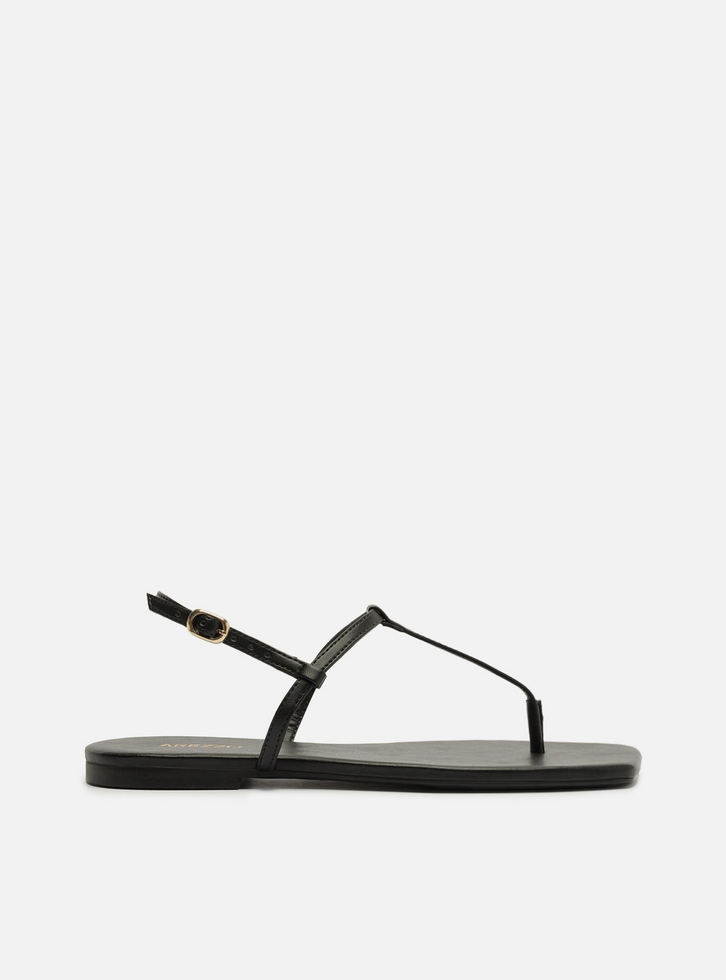 Sandália rasteira feminina preta. O sapato tem sola flat e formato quadrado na ponta. Traz tira fina que passa entre os dedos, conectada a mais uma tira fina na horizontal na parte superior do pé. Possui ainda tira fina em torno do calcanhar com fecho em fivela metálica lateral. Com palmilha da cor da sandália e inscrição do nome da marca. Aberta, a sandália exibe todo o pé.