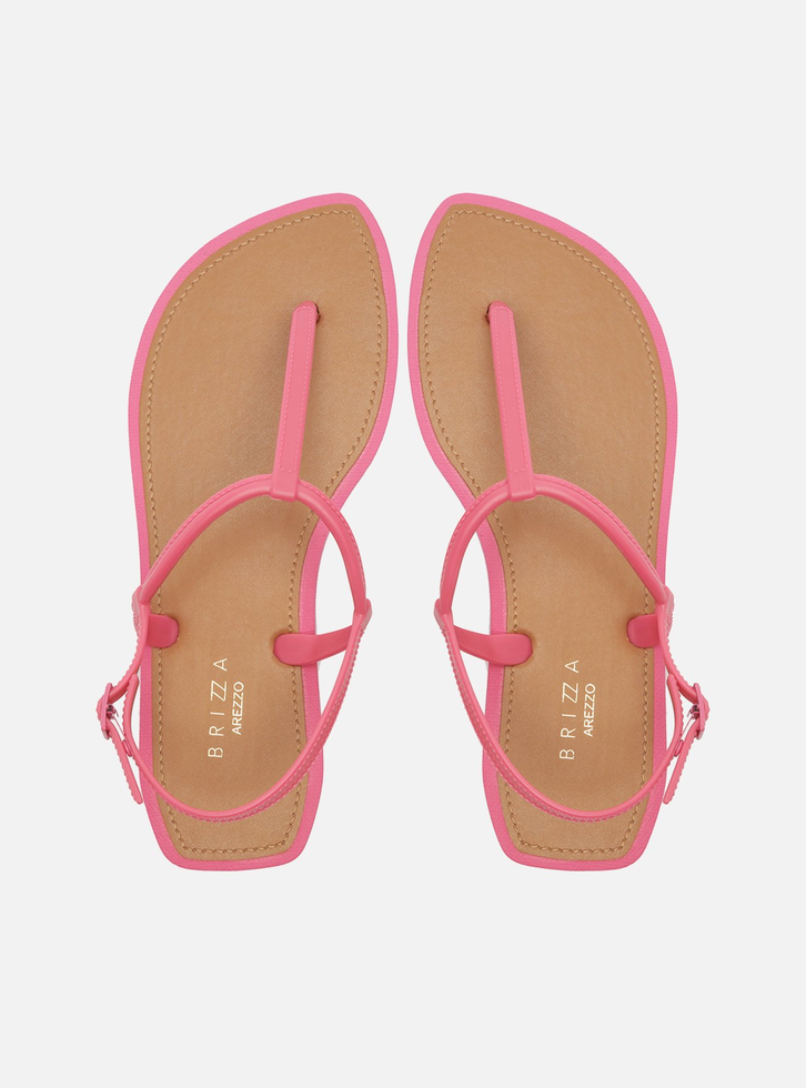 Sandália rasteira rosa. O modelo tem sola flat em borracha e palmilha marrom lisa com contorno em costura pesponto e nome da marca. De bico folha, traz tira fina injetada que passa entre os dedos, conectada a mais uma tira fina no peito do pé. Possui ainda tira fina em torno do calcanhar com fecho em fivela metálica lateral. Aberta, a sandália exibe todo o pé.