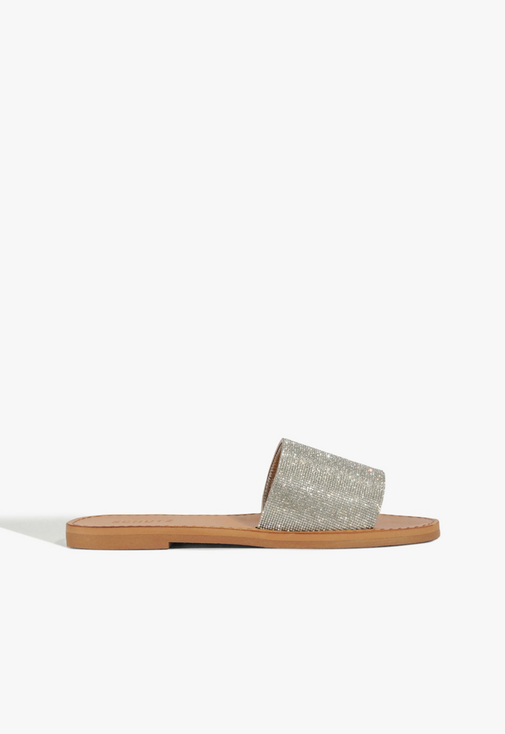 Sandália rasteira confeccionada em couro com bico quadrado e tira larga sobre os dedos com malha de brilho.