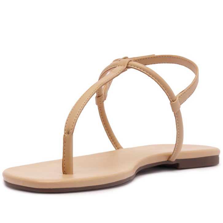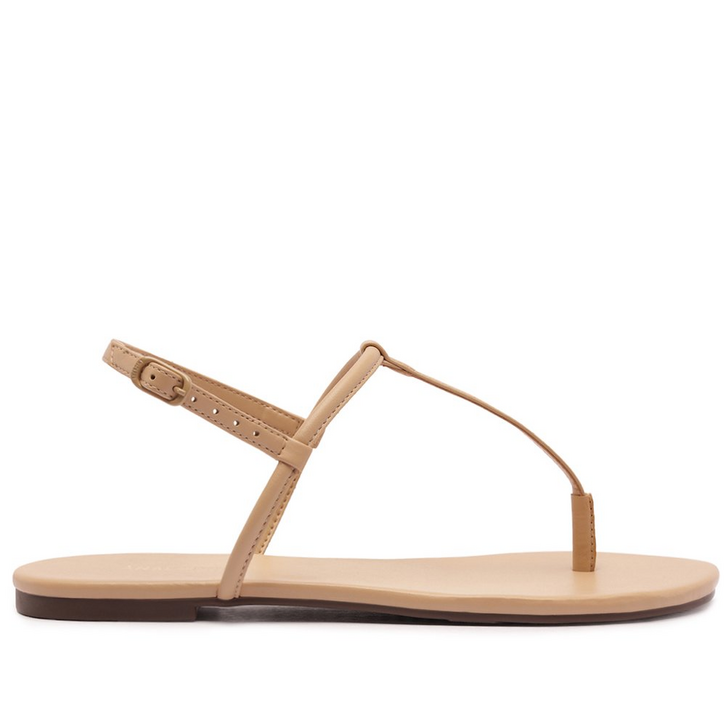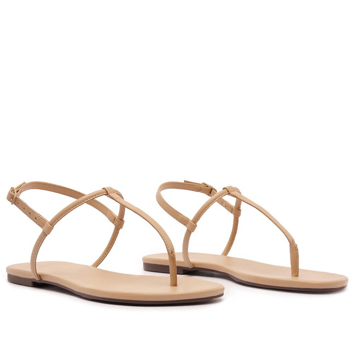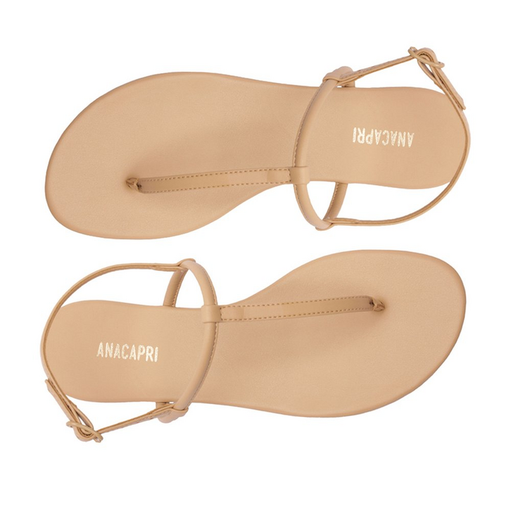 Rasteira slim monocolor, na cor bege. O modelo com shape slim possui sola rasteira flat emborrachada, com leve saltinho traseiro. Com biqueira arredondada, traz cabedal com tira fina central que passa entre os dedos, que se conecta na tira no peito do pé. Possui ainda tira fina que contorna o calcanhar com fecho em fivela lateral. Apresenta palmilha acolchoada, no mesmo tom da rasteirinha, com assinatura Anacapri em carimbo metálico.