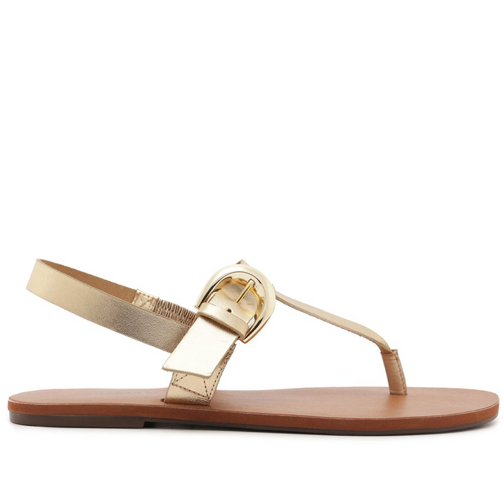 Sandália rasteira com detalhe em fivela, na cor dourada. O modelo com shape slim possui sola rasteira flat emborrachada, com leve saltinho traseiro. Com biqueira arredondada, traz cabedal com tira fina central que passa entre os dedos, que se conecta na tira mais larga, no peito do pé, com fecho lateral por maxi fivela metálica. Possui ainda tira elástica que contorna o calcanhar. Apresenta palmilha nude, com assinatura Anacapri.