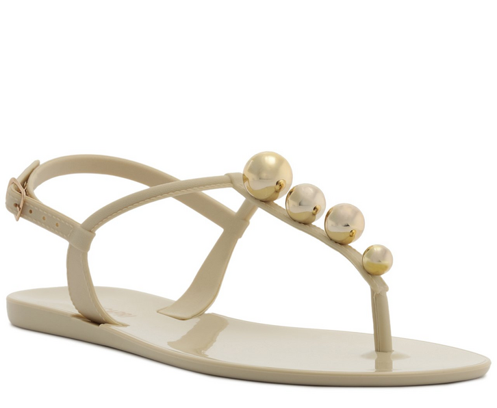 Sandália rasteira slim injetada, com detalhe em esferas, na cor dourada. O modelo possui solado rasteiro e emborrachado, com biqueira arredondada. Em PVC injetado, traz uma tira fininha sobre o peito de pé e uma central entre os dedos, com aplicação de um quarteto de esferas delicadas do mesmo tom da rasteirinha, na gáspea. Na parte traseira, traz fecho em fivela regulável, contornando o calcanhar. Com assinatura Anacapri na palmilha.