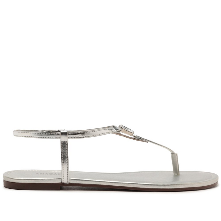 Sandália rasteira slim, com tira elástica e detalhe em pedraria, na cor prateada. De material similar ao couro e biqueira arredondada, possui solado rasteiro e emborrachado, com leve saltinho traseiro. O modelo slim traz cabedal com tira central que separa os dedos e se divide em duas tiras que se prendem nas laterais e contornam o calcanhar na parte traseira elástica, facilitando o calce de encaixe ajustável. Possui aplicação de pedraria imponente na tira central da gáspea. Traz palmilha comfy acolchoada, contornada por pespontos delicados e assinatura Anacapri.