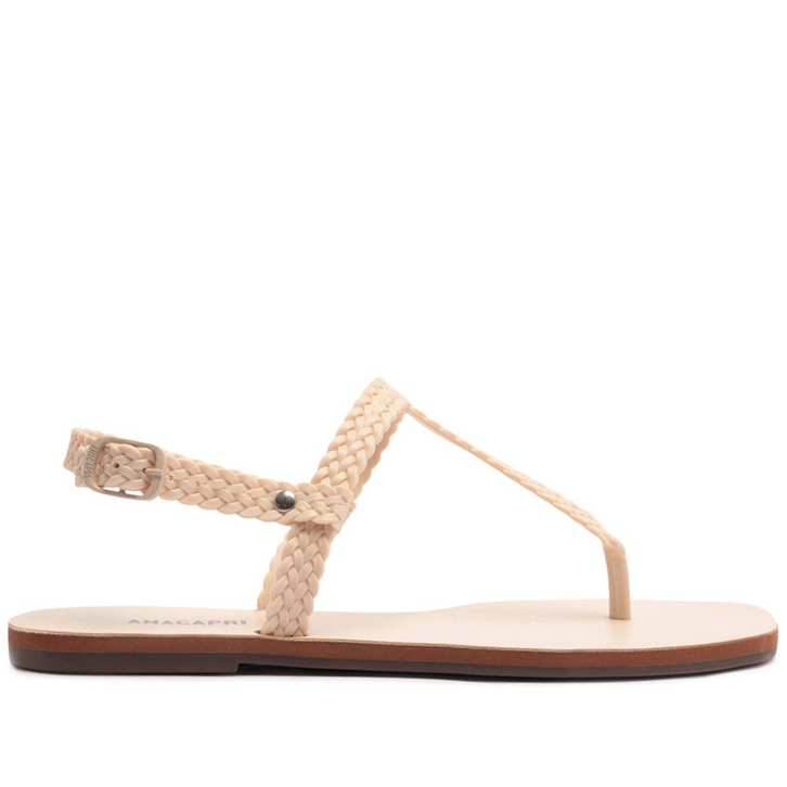 Rasteira branca, em material similar ao couro. O modelo possui solado rasteiro emborrachado e biqueira quadrada. O cabedal é formado por tiras finas em efeito trançado. Traz tira fina que passa entre os dedos, conectada a mais uma tira fina na horizontal. Possui ainda tira fina em torno do calcanhar com fecho em fivela metálica lateral. A palmilha branca vem com assinatura Anacapri.