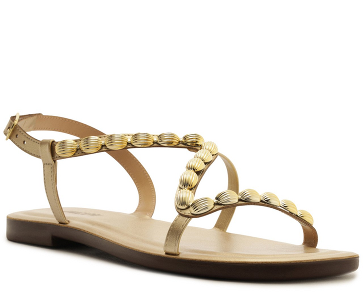 Sandália dourada, em material similar ao couro. O modelo possui solado rasteiro emborrachado e biqueira quadrada. O cabedal traz tira curva sobre os dedos, que segue pelo peito do pé até o tornozelo, com aplicação de pedrarias delicadas. Possui fechamento lateral em fivela metálica ajustável no tornozelo. A palmilha dourada apresenta assinatura Anacapri.