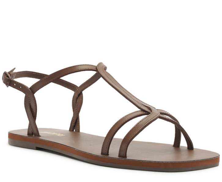 Sandália rasteira de tiras entrelaçadas, na cor marrom. O modelo de material similar ao couro apresenta cabedal com design vazado e imponente, com tirinhas duplas entrelaçadas: elas se cruzam sobre os dedos, perpassam centralizadas no peito de pé e se entrelaçam na parte traseira da peça, pelas laterais. Possui uma tira traseira que contorna o calcanhar, com fecho afivelado lateral. De biqueira arredondada, possui solado rasteiro e emborrachado, com leve saltinho traseiro e palmilha no mesmo tom da sandália, com assinatura Anacapri.