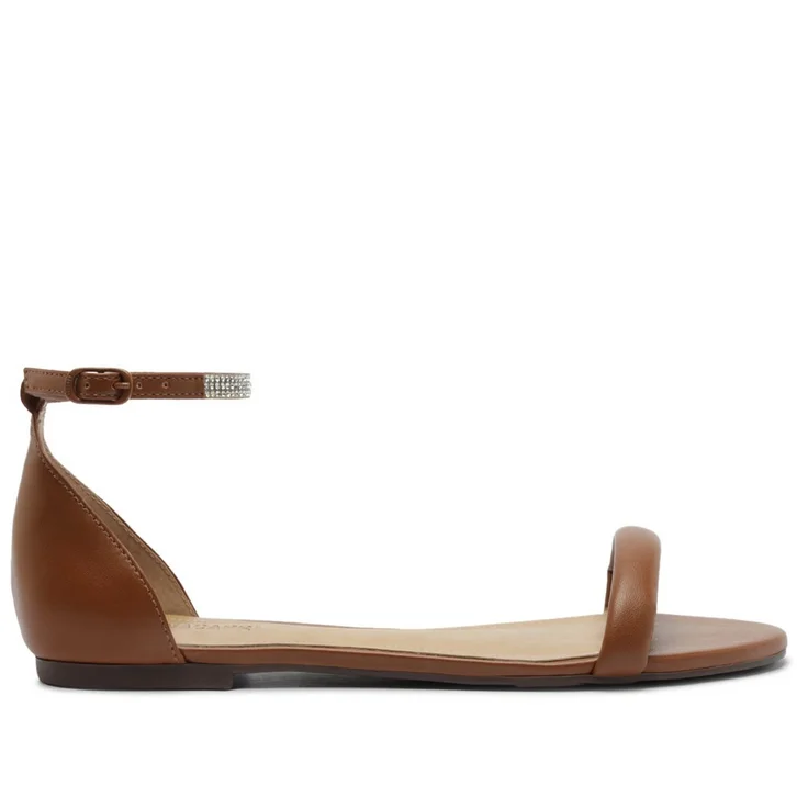 Sandália rasteira, com tira em manta glam, na cor marrom. O modelo possui solado rasteiro e emborrachado, com leve saltinho traseiro. De biqueira arredondada, apresenta cabedal com uma tira bombada sobre os dedos. Fechada no calcanhar, possui tira fina que abraça o tornozelo - em manta suede, com aplicação de strass - com fecho superior em fivela lateral ajustável. Apresenta palmilha comfy, com assinatura Anacapri. A sandália deixa parte dos dedos e laterais à mostra.