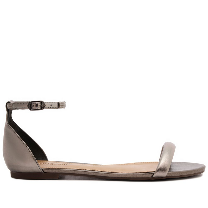 Sandália rasteira, com tira em manta glam, na cor prateada. O modelo possui solado rasteiro e emborrachado, com leve saltinho traseiro. De biqueira arredondada, apresenta cabedal com uma tira bombada sobre os dedos. Fechada no calcanhar, possui tira fina que abraça o tornozelo - em manta suede, com aplicação de strass - com fecho superior em fivela lateral ajustável. Apresenta palmilha comfy, com assinatura Anacapri. A sandália deixa parte dos dedos e laterais à mostra.