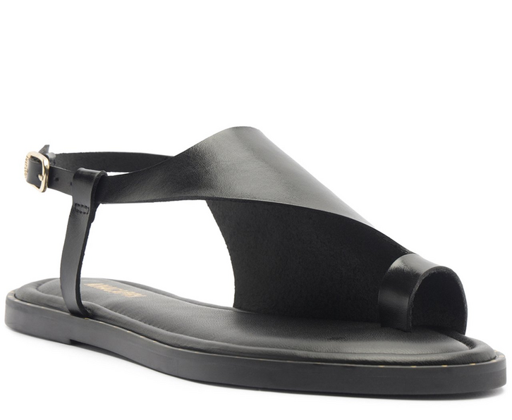 Sandália rasteira de tira assimétrica em couro, na cor preta. O modelo flat possui solado rasteiro e emborrachado, com leve saltinho traseiro. Apresenta cabedal em tira única assimétrica mais larga - de material similar ao couro, com efeito envernizado. Possui um design imponente de recorte que cobre parte do pé e detalhe que separa o dedão dos demais dedos, com tiras que seguem contornando o calcanhar, presa por uma das laterais, com fecho afivelado lateral. De biqueira moderna quadrada, traz palmilha comfy - contornada por tachinhas delicadas - e assinatura Anacapri em carimbo metálico.