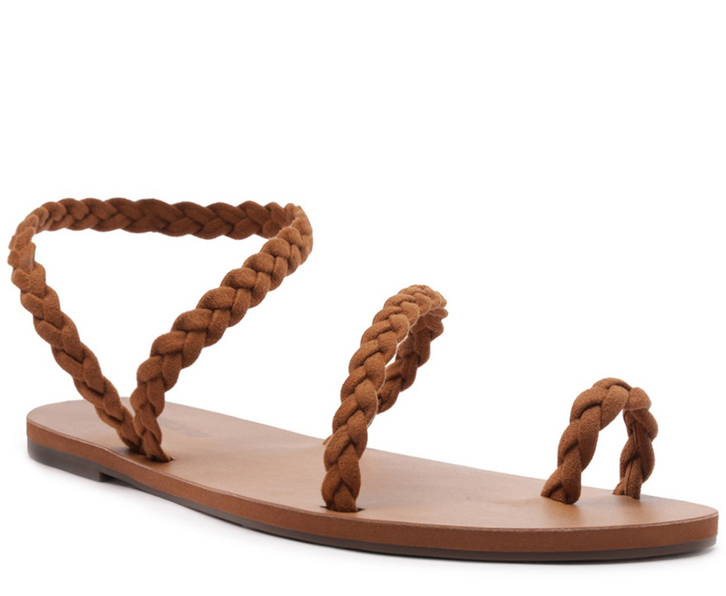 Rasteira de tira trançada com encaixe, na cor marrom. De material similar ao couro e biqueira arredondada, possui solado emborrachado com leve saltinho. O modelo traz cabedal com trio de tirinhas trançadas: uma sobre o dedão, outra que perpassa em curva no peito de pé presa na lateral e uma tira traseira elástica em meia cana transversal - que passa pelo tornozelo, contornando o calcanhar pela lateral, facilitando o calce de encaixe. Traz palmilha marrom, com assinatura Anacapri.