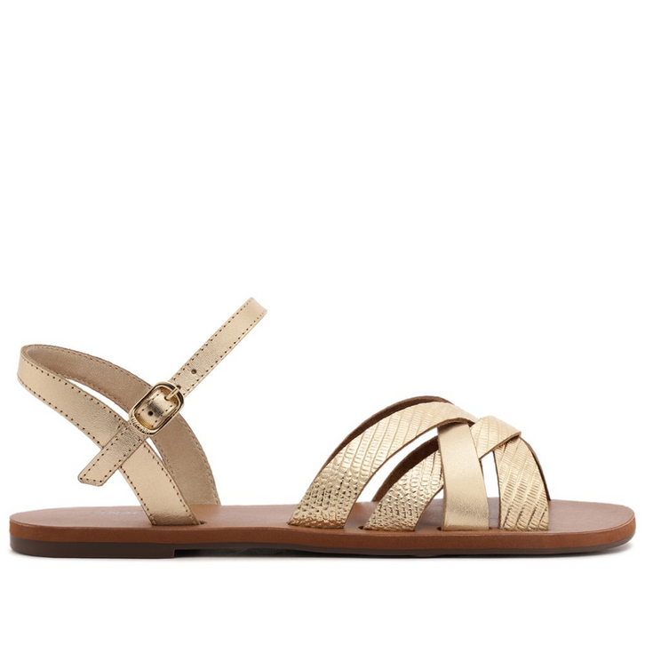 Sandália de tiras entrelaçadas e recortes vazados, na cor dourada. O modelo possui solado rasteiro emborrachado, com leve saltinho traseiro. De biqueira arredondada - com design de recortes vazados - traz quarteto de tiras médias, que se entrelaçam sobre os dedos. De material similar ao couro com acabamento envernizado, apresenta tira que contorna o calcanhar, que se conecta na tira do tornozelo, com fecho lateral afivelado. Apresenta palmilha comfy marrom, com assinatura Anacapri. A sandália deixa parte dos dedos e laterais à mostra.