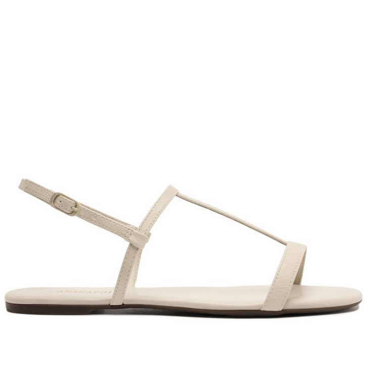 Sandália rasteira de tiras assimétricas, na cor branca. O modelo possui solado rasteiro e emborrachado, com leve saltinho traseiro e biqueira arredondada. Traz cabedal em tiras com design de recorte - uma sobre os dedos, outra sobre o peito de pé e uma central - que se conectam entre si, com detalhe para contorno em pespontos delicados. Possui tira traseira que contorna o calcanhar, com fecho afivelado lateral. Possui palmilha comfy, do mesmo tom da rasteirinha, com assinatura Anacapri.