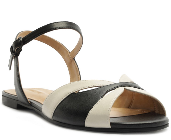 Sandália rasteira com detalhe de recortes, nos tons de preto e branco. Apresenta cabedal com design de recortes vazados na parte superior da peça, sobre os dedos. De material similar ao couro e biqueira arredondada, possui solado emborrachado, com leve saltinho traseiro. Possui tira traseira que contorna o calcanhar, que se conecta na tira superior, com fecho afivelado na lateral do tornozelo. Traz palmilha acolchoada no mesmo tom da sandália, com assinatura Anacapri.