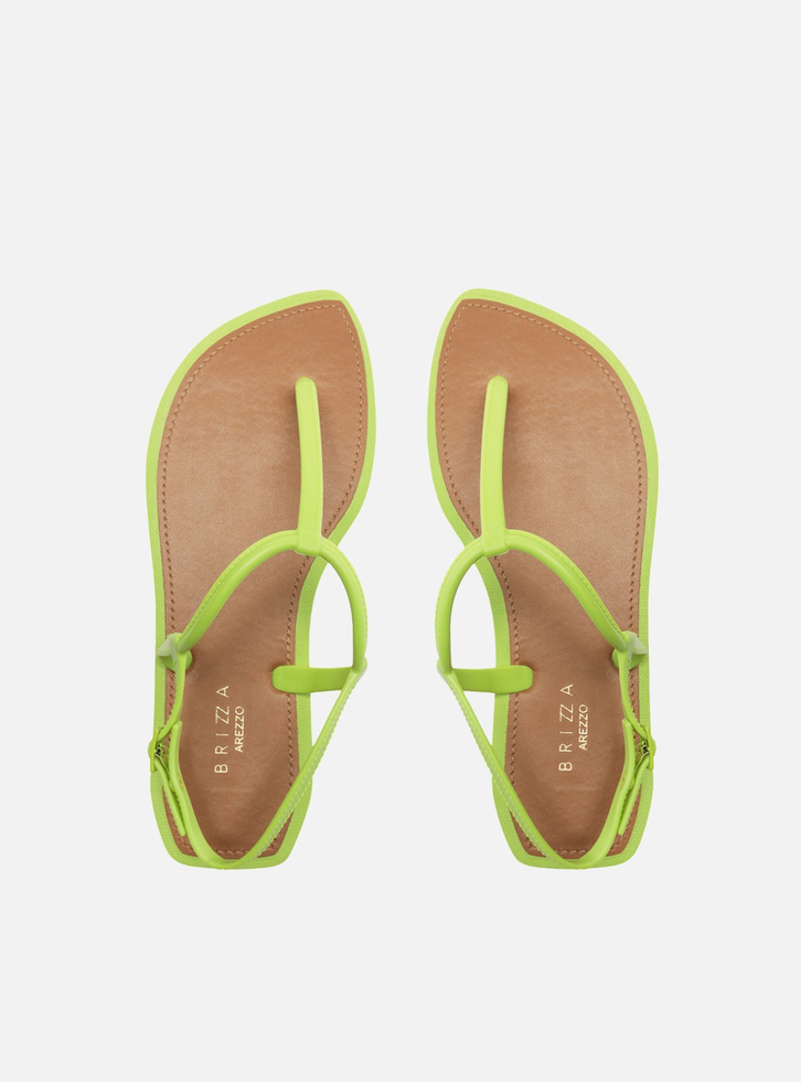 Sandália rasteira verde. O modelo tem sola flat em borracha e palmilha marrom lisa com contorno em costura pesponto e nome da marca. De bico folha, traz tira fina injetada que passa entre os dedos, conectada a mais uma tira fina no peito do pé. Possui ainda tira fina em torno do calcanhar com fecho em fivela metálica lateral. Aberta, a sandália exibe todo o pé.