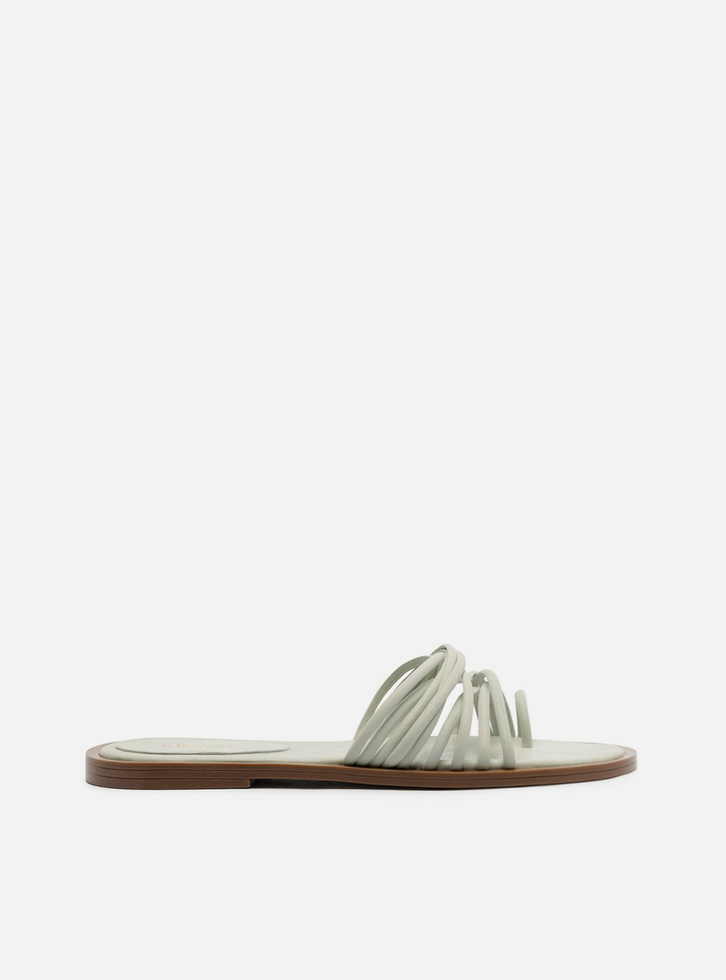 Sandália feminina verde soft. O sapato tem sola rasteira flat e formato arredondado na ponta. Possui diversas tiras finas na parte superior do pé e tira dedeira que garante sustentação. Com palmilha da cor do sapato e inscrição do nome da marca. A sandália exibe todo o pé.