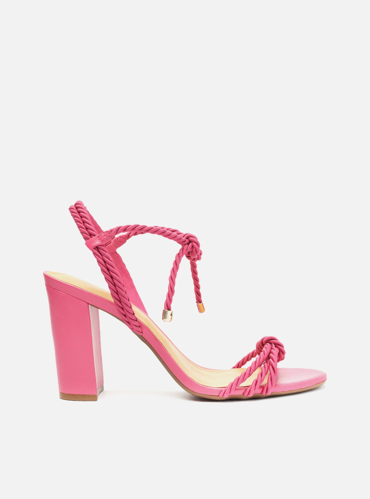 Sandália rosa. O modelo tem salto alto bloco e bico redondo. Traz tiras em cordão torcido sobre os dedos, unidas por nó central, e no peito do pé, conectadas a tira no calcanhar, fechando em amarração no tornozelo. Com palmilha bege e inscrição do nome da marca. A sandália é aberta e exibe todo o pé.