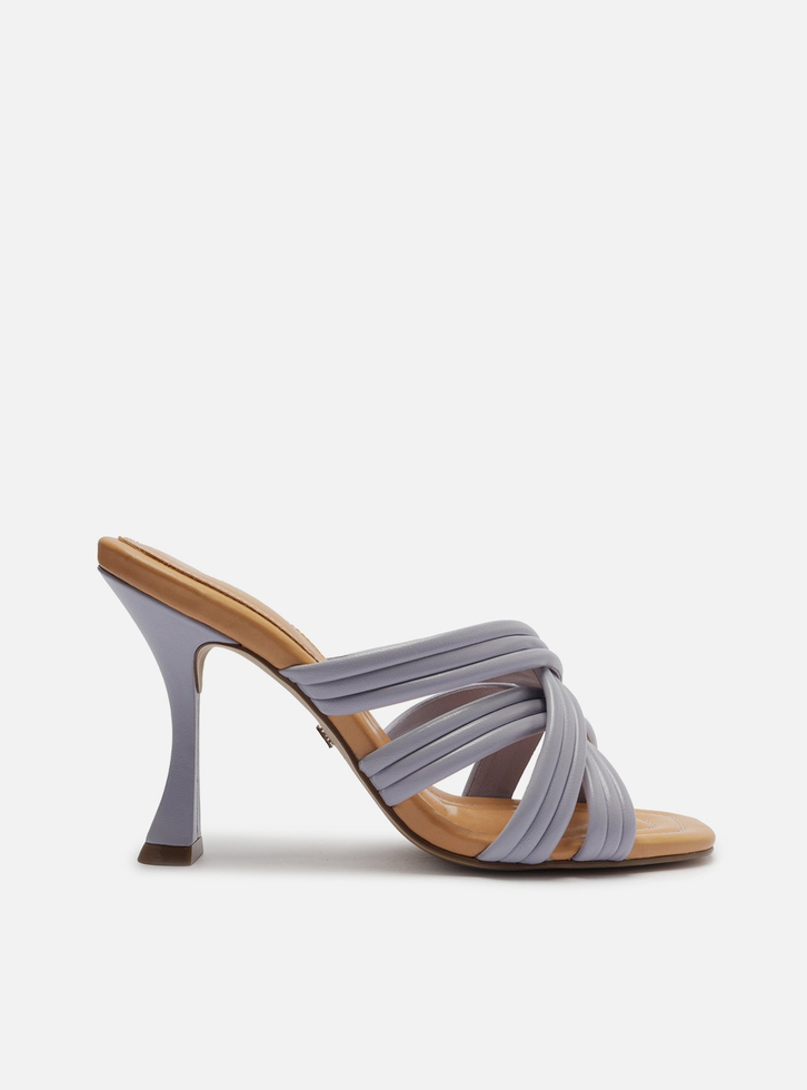 Sandália roxa. O modelo tem salto alto fino taça roxo e bico quadrado. Traz tiras bombadas e triplas, cruzadas sobre os dedos e o peito do pé. Com palmilha marrom, estofada, com costuras pesponto e inscrição do nome da marca. A sandália exibe parte do pé.