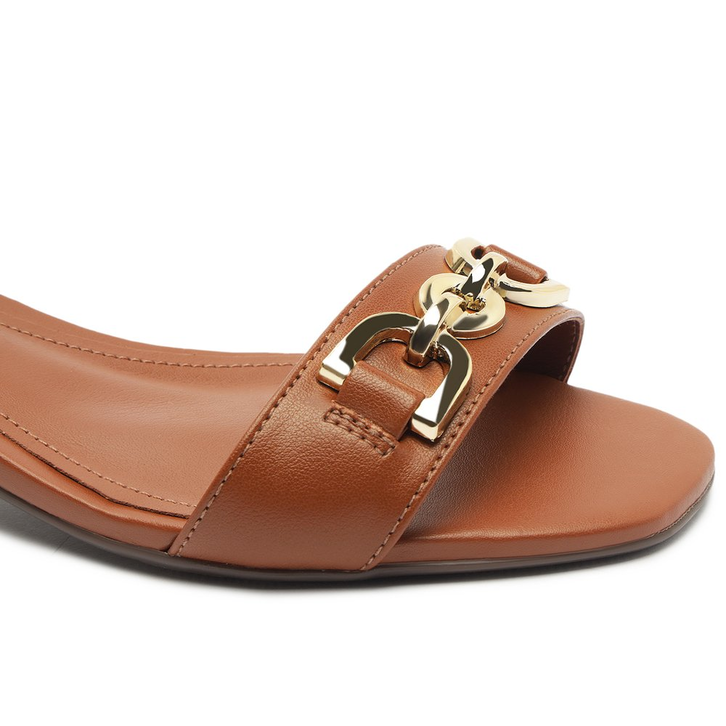 Sandália de salto bloco com detalhe em corrente, na cor marrom. O modelo possui salto em bloco médio e biqueira quadrada. Traz cabedal com tira média sobre os dedos e detalhe imponente em correntaria metálica - aplicada na gáspea. Com tira traseira que contorna o calcanhar, conectada na tira do tornozelo, com fecho lateral afivelado. Apresenta palmilha de mesmo tom da sandália, contornada em pespontos delicados, com assinatura Anacapri.