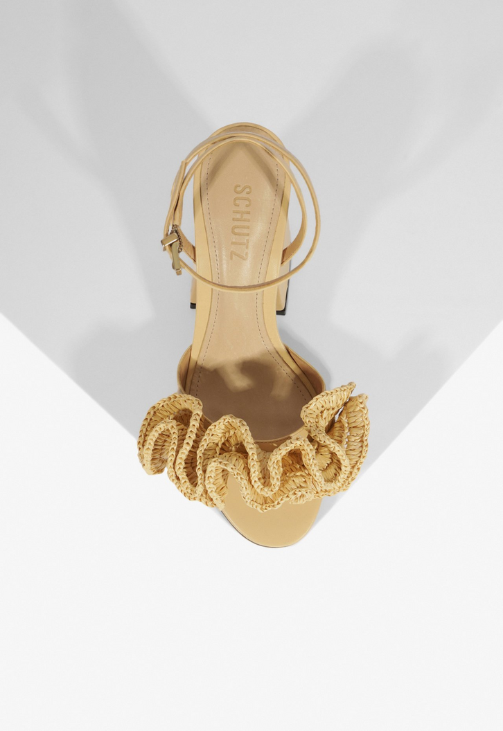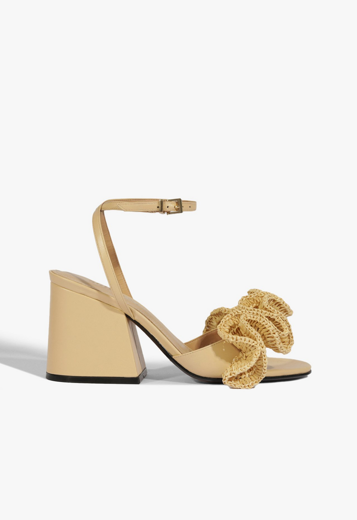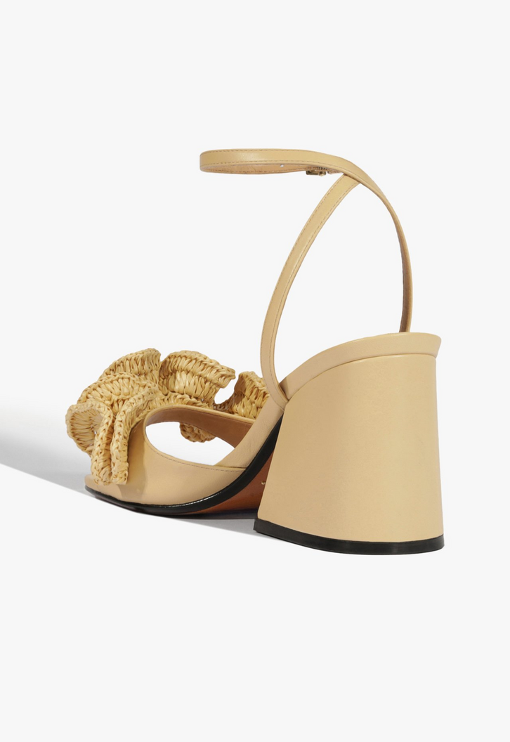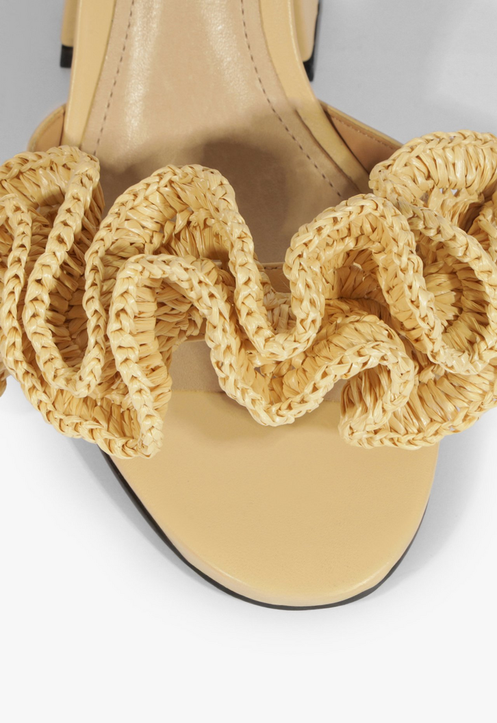 Com um design moderno e toque artesanal, esta sandália bege em couro conquista por seu confortável salto bloco geométrico imponente e pela tira em ráfia trançada com acabamento volumoso, adicionando textura e charme ao visual. O fechamento por fivela na delicada tira no tornozelo garante o ajuste perfeito. Aposte!