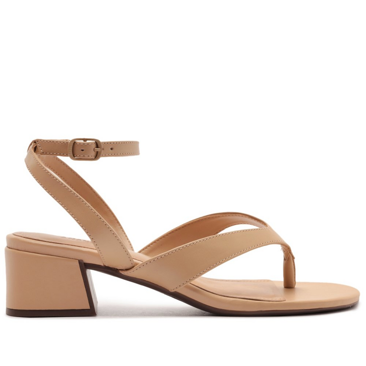 Sandália de tira única e salto bloco, na cor bege. O modelo possui salto em bloco baixo e biqueira arredondada. Traz cabedal com tira central única, com design triangular, que separa os dedos, presa nas laterais. Na parte traseira, traz tira que contorna o calcanhar, presa na tira que abraça o tornozelo, com fecho afivelado lateral. Com palmilha acolchoada, contornada em pespontos delicados no mesmo tom da sandália e assinatura Anacapri em carimbo metálico.