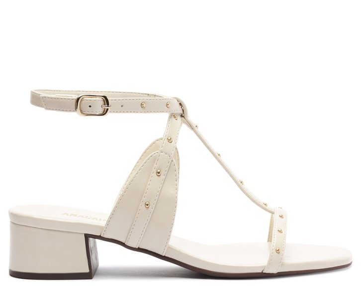 Sandália Folk de salto bloco, com detalhe em tachas, na cor branca. O modelo possui salto em bloco médio e biqueira quadrada. Apresenta cabedal em tirinha fina sobre os dedos - conectada por tira central que segue pela parte superior do peito de pé, presa pelas laterais em tiras mais largas, com fecho lateral afivelado, na tira que contorna o tornozelo. Detalhe para aplicação de tachas metálicas nas tiras. Traz palmilha acolchoada no mesmo tom da rasteirinha, com assinatura Anacapri.