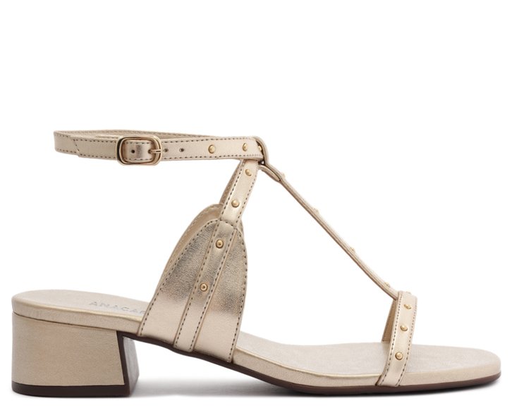 Sandália Folk de salto bloco, com detalhe em tachas, na cor marrom dourada. O modelo possui salto em bloco médio e biqueira quadrada. Apresenta cabedal em tirinha fina sobre os dedos - conectada por tira central que segue pela parte superior do peito de pé, presa pelas laterais em tiras mais largas, com fecho lateral afivelado, na tira que contorna o tornozelo. Detalhe para aplicação de tachas metálicas nas tiras. Traz palmilha acolchoada no mesmo tom da sandália, com assinatura Anacapri.