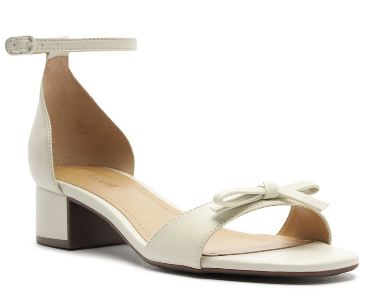 Sandália de salto bloco, com detalhe em lacinho, na cor branca. O modelo de material similar ao couro possui salto em bloco médio. De biqueira quadrada, traz cabedal com uma tira mais larga sobre os dedos, com aplicação de lacinho delicado na gáspea. Fechada no calcanhar, possui tira fina que abraça o tornozelo, com fecho superior em fivela lateral ajustável. Apresenta palmilha comfy, com assinatura Anacapri. A sandália deixa parte dos dedos e laterais à mostra.