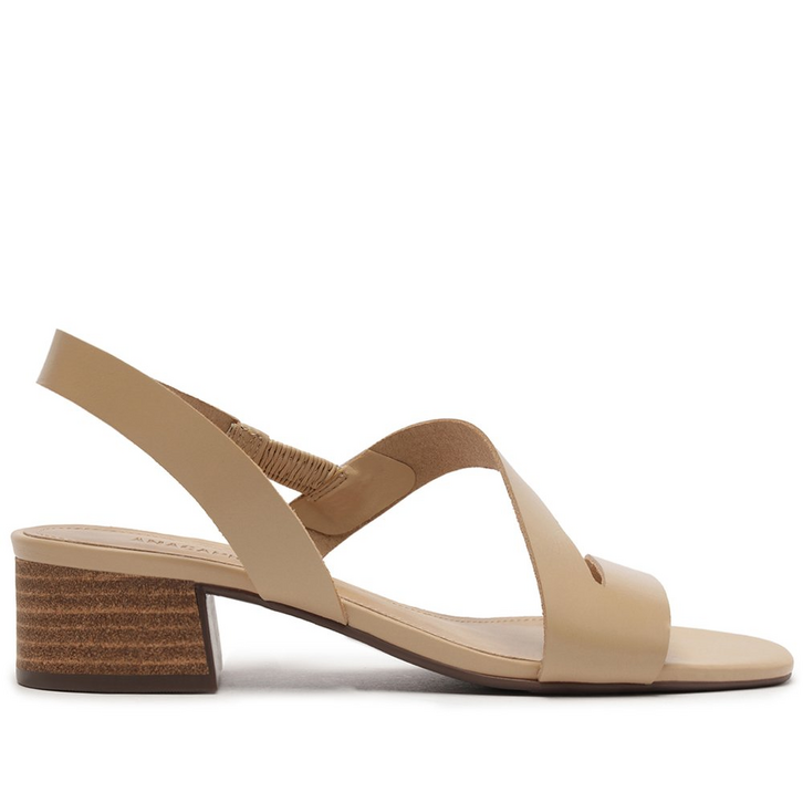 Sandália de salto bloco, com detalhe de recortes, na cor bege. O modelo possui salto em bloco médio e biqueira quadrada. Apresenta cabedal com tiras mais largas e assimétricas, com design imponente de recortes vazados - sobre os dedos e peito de pé - formando a letra A na lateral. Traz uma tira elástica na parte traseira que contorna o calcanhar pelas laterais, facilitando o calce de encaixe. Com palmilha comfy no mesmo tom da sandália, com assinatura Anacapri.