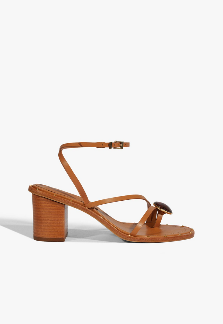 Sandália em couro, com cabedal composto por tira fina sobre os dedos e outra em diagonal no peito do pé, unidas por detalhe com studs de pedra, com detalhe de mini studs dourados ao redor da sola. Possui fechamento por fivela ajustável e salto médio bloco.