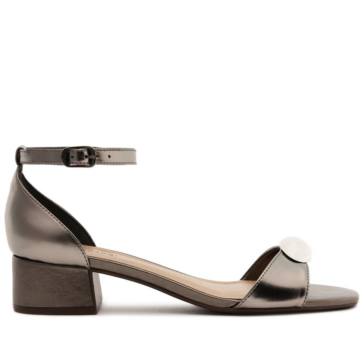 Sandália de salto bloco, com aplicação de pedraria, na cor prateada. O modelo de salto em bloco médio possui biqueira arredondada e traz cabedal com uma tira mais larga sobre os dedos, com aplicação de maxi pedraria imponente na gáspea. Fechada no calcanhar, possui tira fina que abraça o tornozelo, com fecho superior em fivela lateral ajustável. Apresenta palmilha comfy, com assinatura Anacapri. A sandália deixa parte dos dedos e laterais à mostra.