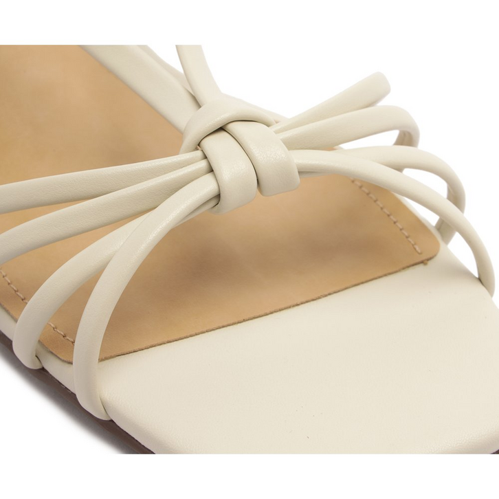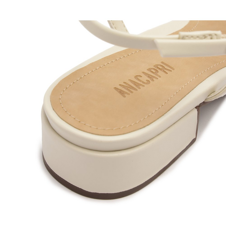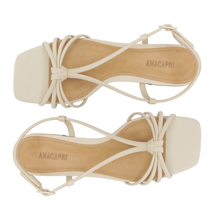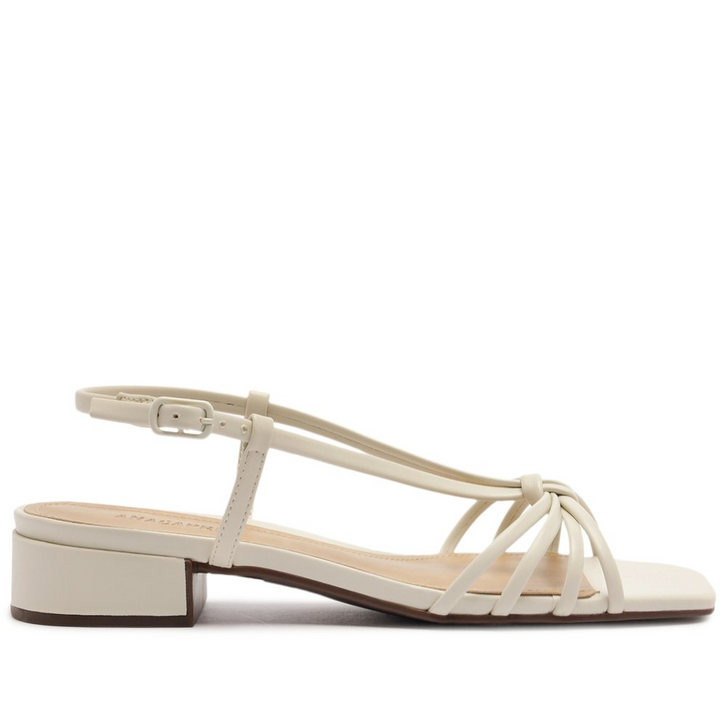 Sandália de salto bloco com detalhe em nó, na cor branca. O modelo tem salto em bloco baixo e biqueira quadrada. Traz cabedal com trio de tirinhas sobre os dedos, com arremate central por nó delicado. Elas seguem pela pala, presa por tirinhas laterais, contornando o calcanhar, com fecho em fivela metálica lateral. Com palmilha comfy no mesmo tom da sandália e assinatura Anacapri.