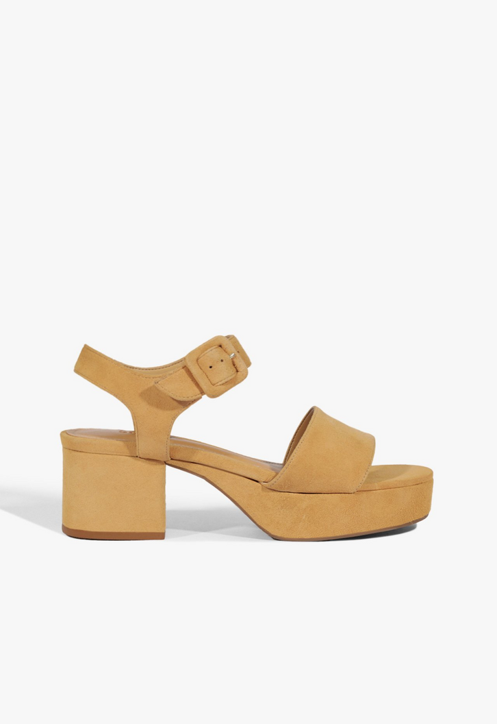 Sandália confeccionada em couro. O modelo conta com tira larga na região dos dedos, fechamento por fivela ajustável no tornozelo, salto médio bloco e plataforma frontal.