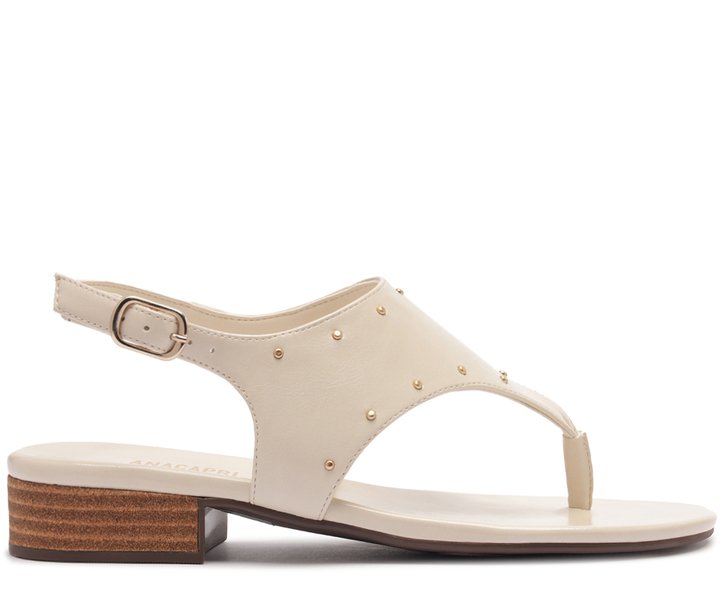 Sandália de salto bloco, com aplicação de tachas, na cor branca. O modelo de material similar ao couro traz biqueira arredondada. De salto em bloco baixo, possui cabedal com tira única e central mais larga na gáspea, com design triangular e que separa os dedos - com aplicação de tachas metálicas imponentes no contorno. Ela segue até a pala abraçando o tornozelo e contorna o calcanhar, com fecho regulável em fivela metálica na lateral. Apresenta palmilha acolchoada no mesmo tom da sandália, com assinatura Anacapri.