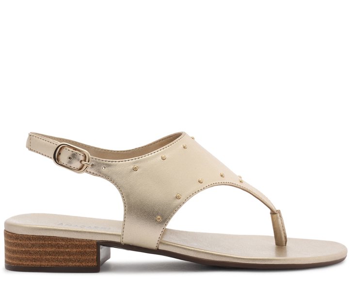 Sandália de salto bloco, com aplicação de tachas, na cor dourada. O modelo de material similar ao couro traz biqueira arredondada. De salto em bloco baixo, possui cabedal com tira única e central mais larga na gáspea, com design triangular e que separa os dedos - com aplicação de tachas metálicas imponentes no contorno. Ela segue até a pala abraçando o tornozelo e contorna o calcanhar, com fecho regulável em fivela metálica na lateral. Apresenta palmilha acolchoada no mesmo tom da sandália, com assinatura Anacapri.