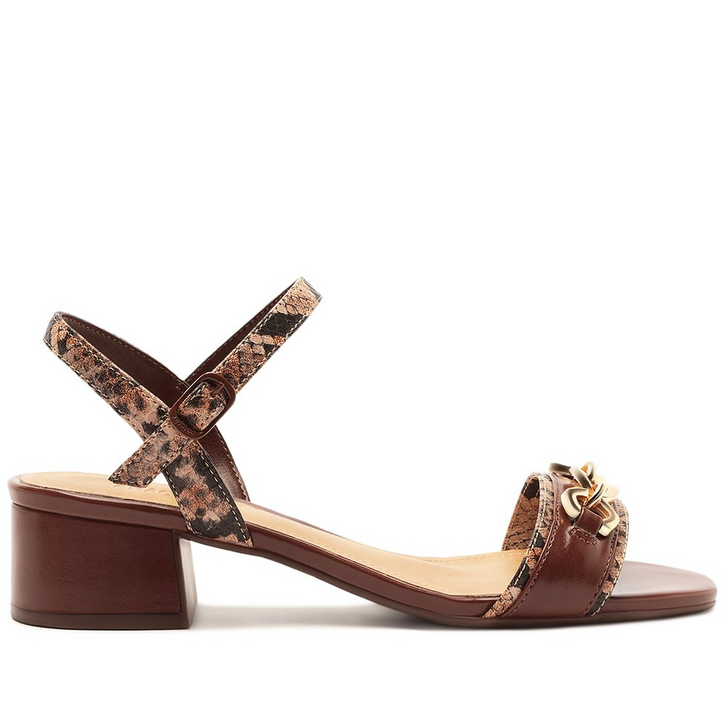 Sandália de salto bloco, com detalhe em elos metálicos, em animal print. O modelo apresenta cabedal em material similar ao couro, com estampa animal print de cobra. Possui uma tira mais larga sobre os dedos, com detalhe imponente em aplicação de tira sobreposta, com maxi elos metálicos - estilo corrente. De biqueira quadrada, possui salto em bloco médio e palmilha comfy, com assinatura Anacapri. Com tira traseira que contorna o calcanhar, conectada na tira que abraça o tornozelo, apresenta fecho lateral afivelado.