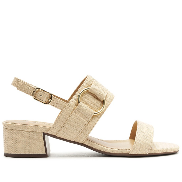 Sandália de salto bloco com detalhe em elo metálico, na cor bege. O modelo apresenta cabedal em tecido tramado natural, com duas tiras - uma sobre os dedos, outra mais larga sobre o peito de pé, com detalhe imponente em aplicação de tira sobreposta, com maxi elo metálico e redondo na tira traseira. Traz tira que contorna o calcanhar, conectada na tira sobre o peito de pé, com fecho afivelado na lateral. De biqueira quadrada, possui salto em bloco médio e palmilha comfy, com assinatura Anacapri.