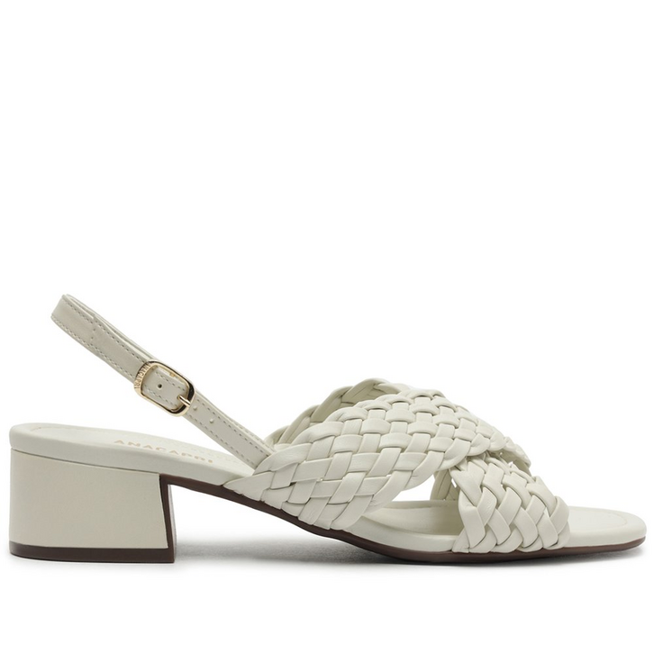 Sandália de salto bloco e tiras trançadas, na cor branca. O modelo imponente apresenta cabedal com duas tiras mais largas - com efeito trançado - que se cruzam sobre os dedos. De material similar ao couro e biqueira moderna quadrada, possui salto em bloco médio. Na parte traseira, traz tirinha lateral que contorna o calcanhar, com fecho afivelado. Apresenta palmilha comfy no mesmo tom da peça, com assinatura Anacapri.