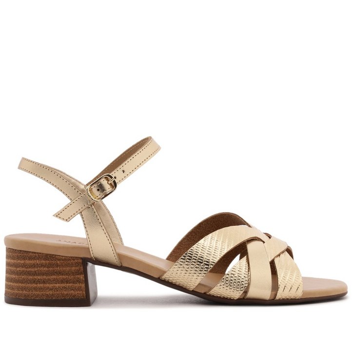 Sandália de salto bloco, de tiras entrelaçadas e recortes vazados, na cor dourada. O modelo possui salto em bloco médio e biqueira arredondada. Traz cabedal com design de recortes vazados - em quarteto de tiras médias, que se entrelaçam sobre os dedos. De material similar ao couro com acabamento envernizado, apresenta tira que contorna o calcanhar, que se conecta na tira do tornozelo, com fecho lateral afivelado. Apresenta palmilha comfy bege, com assinatura Anacapri. A sandália deixa parte dos dedos e laterais à mostra.