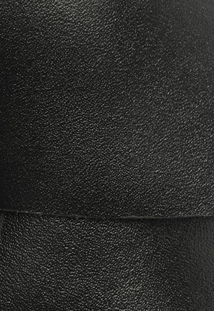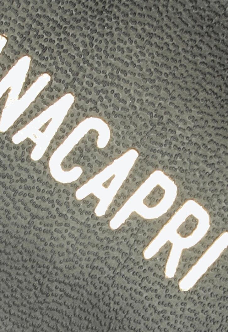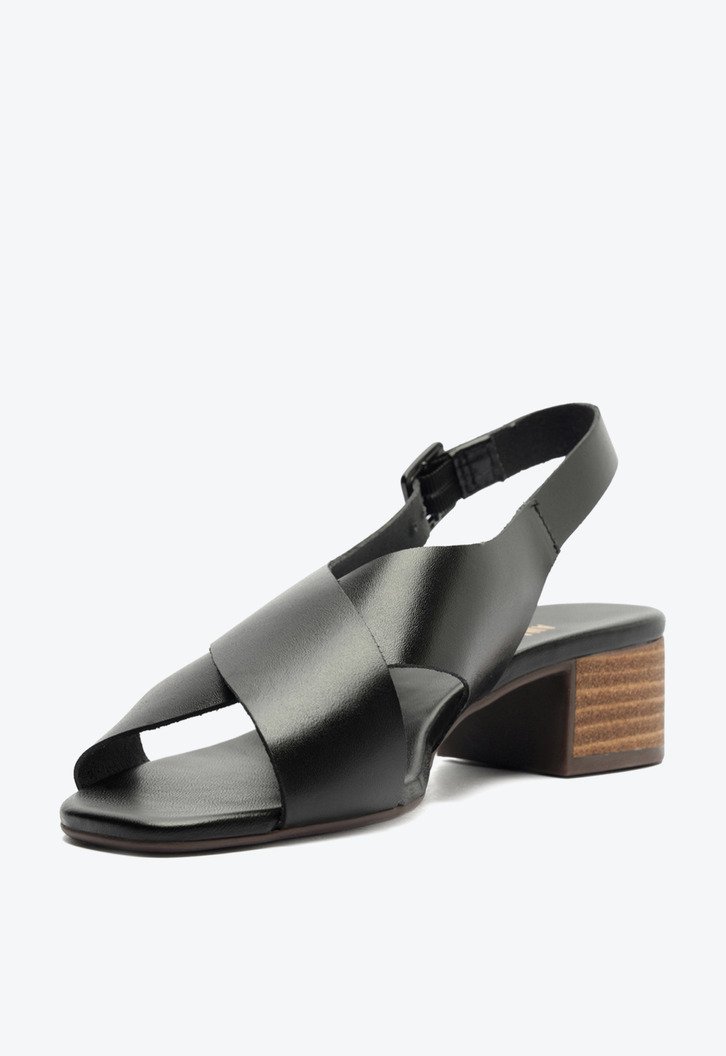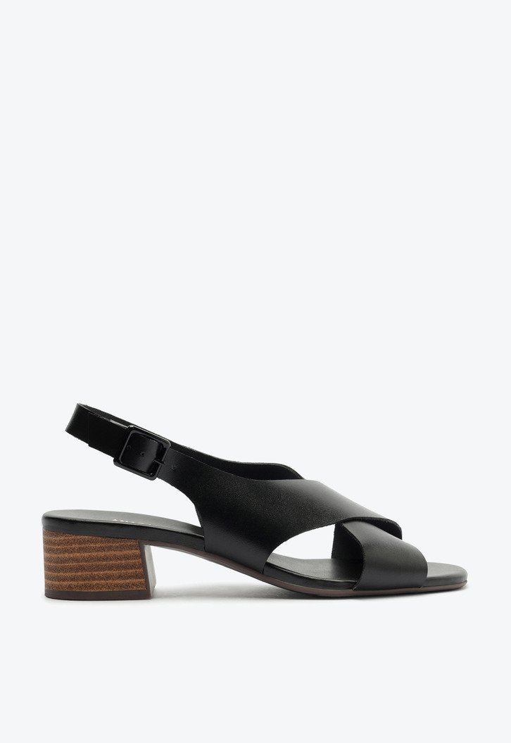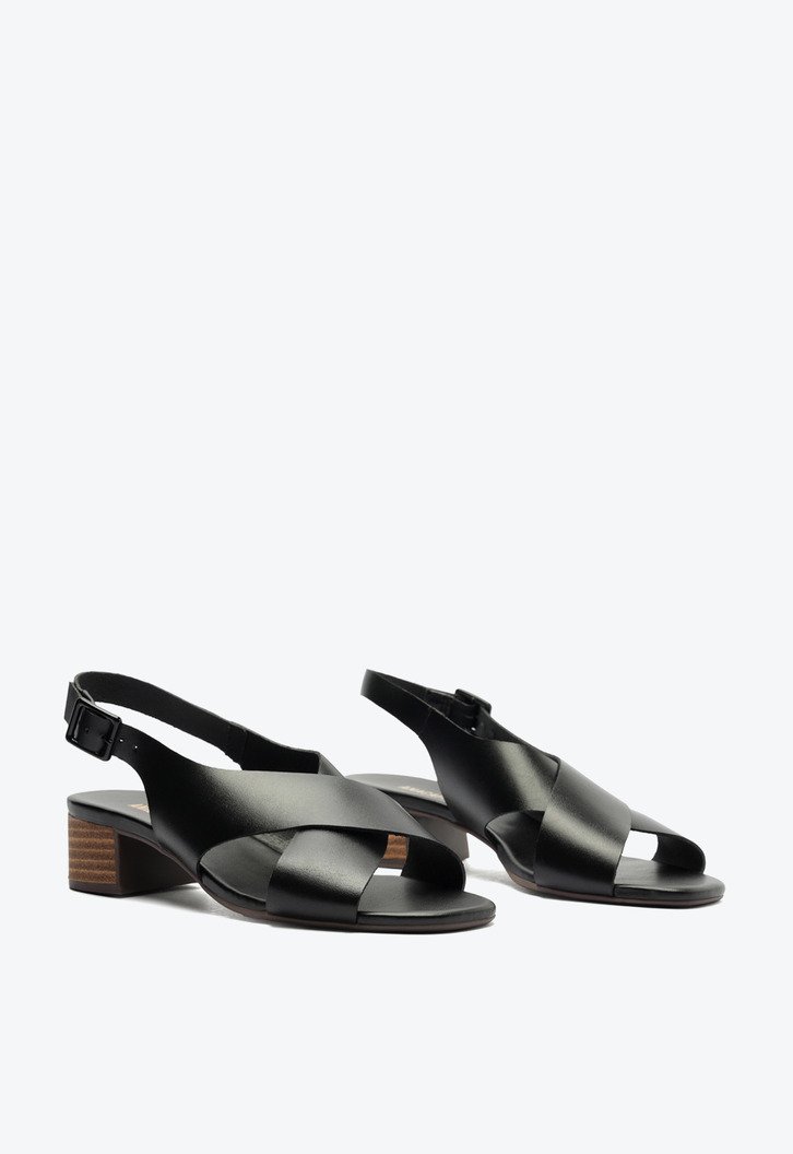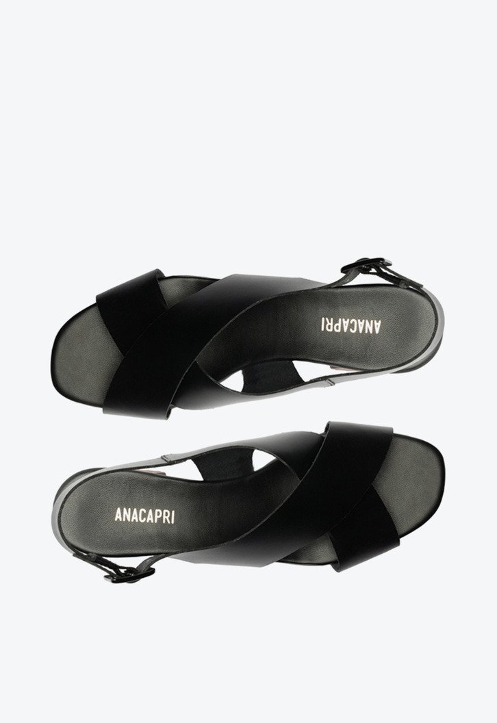 Sandália de salto bloco e tiras cruzadas, na cor preta. O modelo de material similar ao couro, possui salto em bloco médio. Apresenta cabedal em duas tiras mais largas - que se cruzam em design de “X” - sobre os dedos e peito de pé, que seguem pelas laterais da pala e contornam o calcanhar, com fecho afivelado ajustável na lateral. De biqueira quadrada, traz palmilha acolchoada de mesmo tom da peça, com assinatura Anacapri.