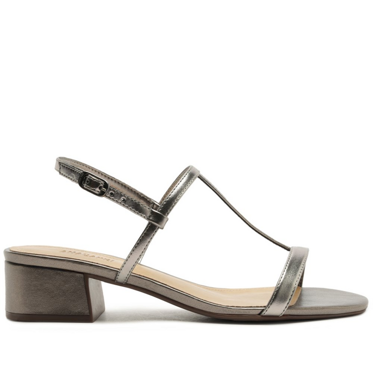 Sandália de salto bloco e tiras assimétricas, na cor prateada. O modelo possui salto em bloco médio e biqueira quadrada. Traz cabedal em tiras com design de recorte - uma sobre os dedos, outra sobre o peito de pé e uma central - que se conectam entre si, com detalhe para contorno em pespontos delicados. Possui tira traseira que contorna o calcanhar, com fecho afivelado lateral. Possui palmilha comfy, do mesmo tom da rasteirinha, com assinatura Anacapri.