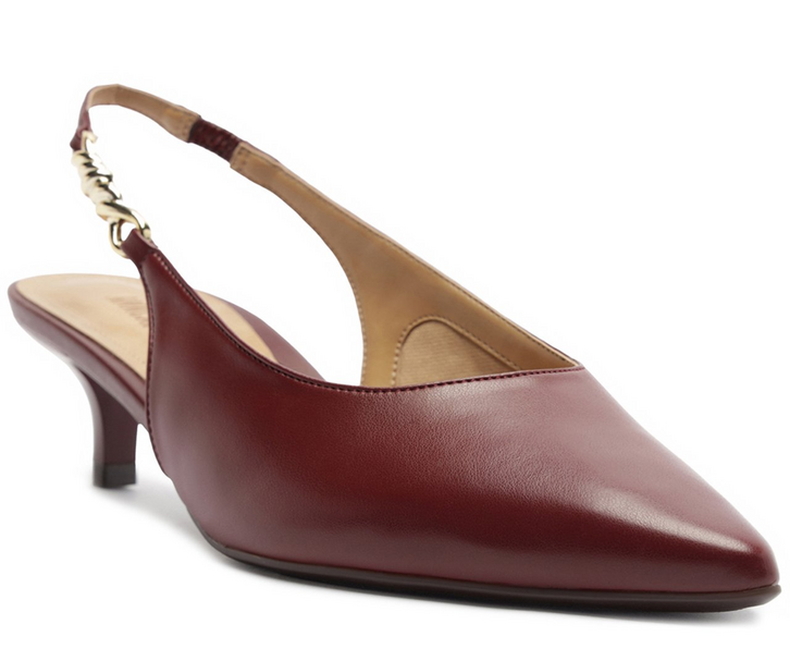 Scarpin de salto fino, com detalhe em adorno metálico, na cor vermelha. O modelo, de material similar ao couro, possui salto médio e bico fino. Estilo slingback - aberto atrás, traz tiras finas conectadas ao cabedal que seguem pelas laterais em elástico. Detalhe para aplicação de adorno metálico central, com efeito torcido, em uma das laterais. Essas mesmas tiras seguem até a parte traseira e contornam o calcanhar, presas pelas tiras de apoio fixas nas laterais. Com palmilha nude e assinatura Anacapri, o scarpin deixa o peito do pé e calcanhar à mostra.