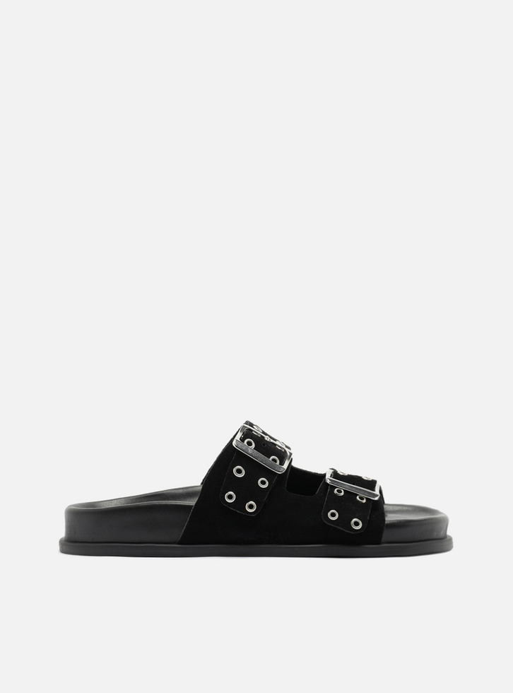 Sandália feminina preta em couro. O sapato tem salto rasteiro, palmilha lisa com formato anatômico e gravação do nome da marca. Possui solado flatform, base emborrachada e formato arredondado na ponta. Traz tiras largas com aplicação de ilhoses, sobre os dedos e na parte superior do pé, e fivelas metálicas laterais.