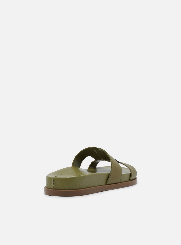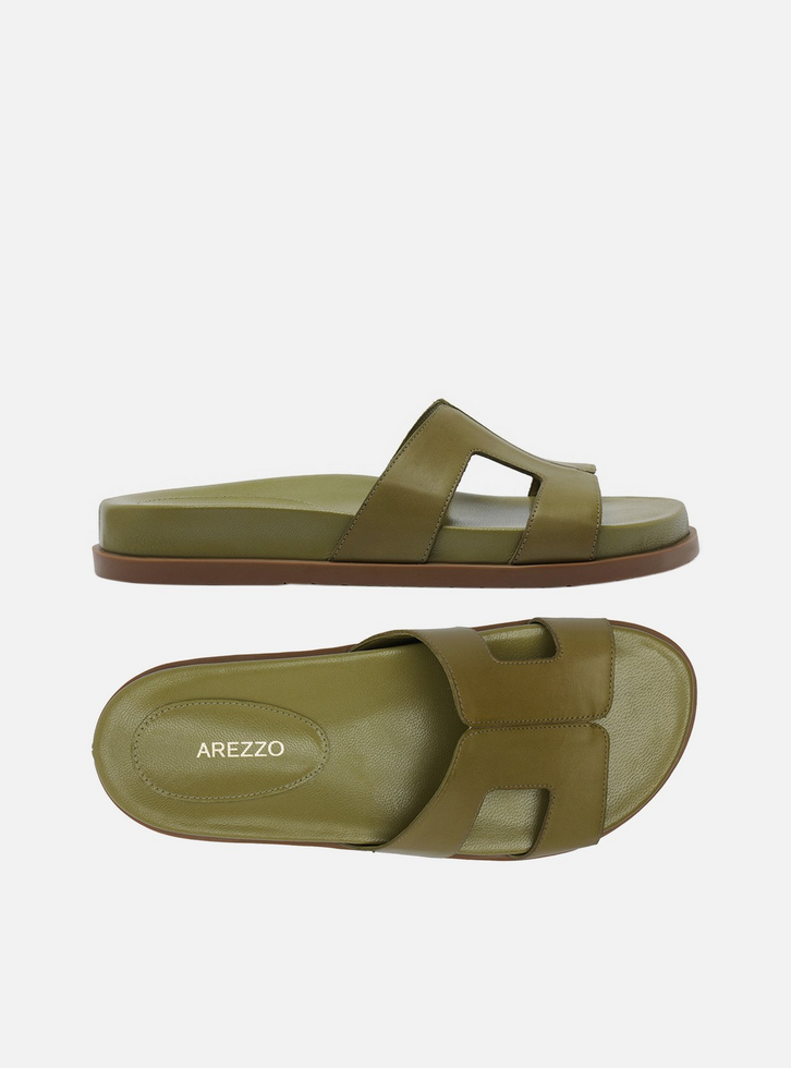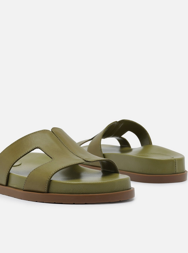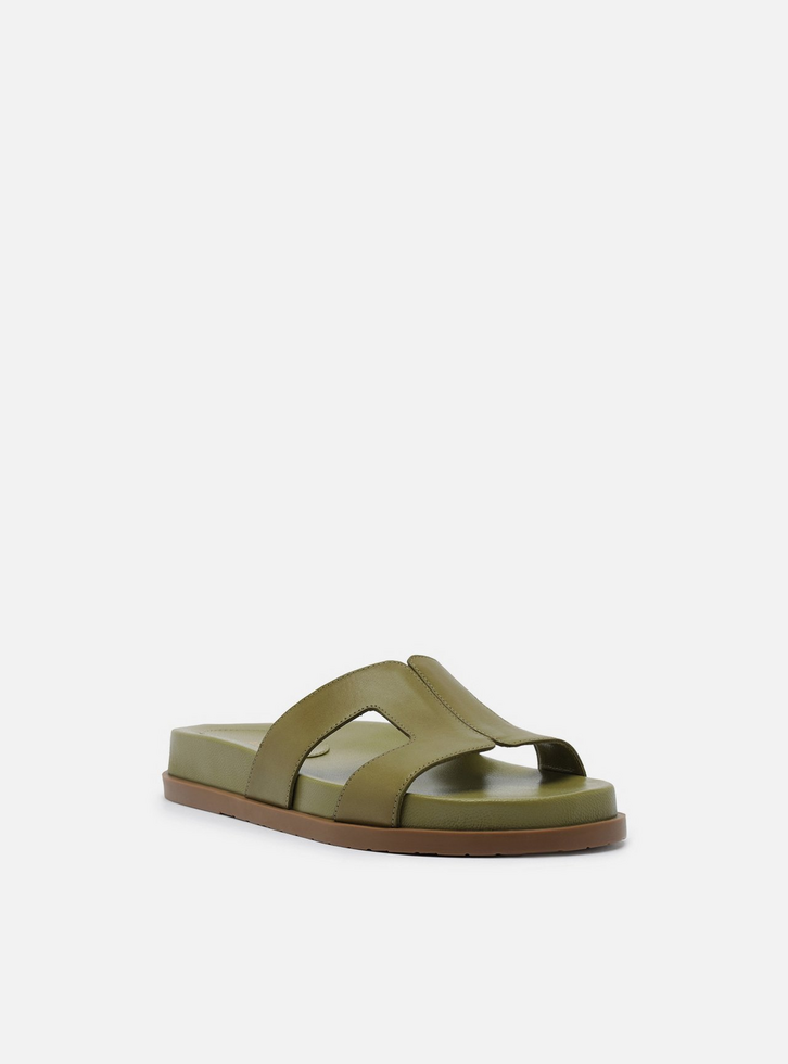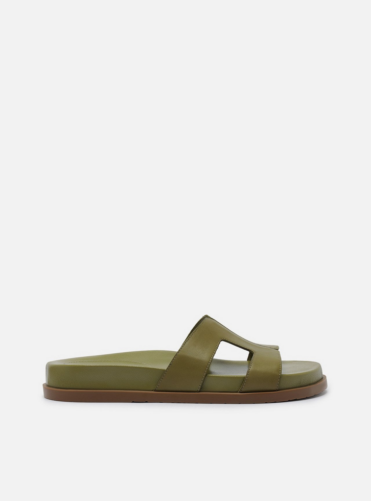 Sandália slide verde de couro. O sapato tem salto rasteiro, palmilha com formato anatômico e inscrição do nome da marca. Possui solado flatform, base emborrachada e formato arredondado na ponta. Traz cabedal com recortes laterais amplos que valorizam o calce, além de costuras pesponto por todo o contorno. Aberta, deixa parte do pé à mostra.