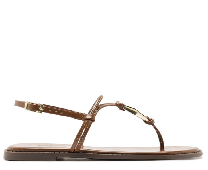 Sandália marrom, em material similar ao couro. O modelo possui sola flat marrom e biqueira arredondada. O cabedal é formado por tiras finas que dividem os dedos e se encontram ao centro, unidas por argola metálica redonda em destaque. Tira traseira envolve o calcanhar e se conecta à tira do tornozelo, com fechamento lateral em fivela metálica ajustável. A palmilha marrom apresenta assinatura Anacapri.
