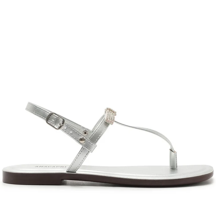 Sandália rasteira com aplicação de laço glam, na cor prateada. De material similar ao couro, o modelo possui solado rasteiro e emborrachado, com design curvado e leve saltinho traseiro. De biqueira arredondada, traz acabamento metalizado, com tira fininha sobre o peito de pé e uma central entre os dedos, com aplicação na gáspea de lacinho delicado, em manta suede glam. Na parte traseira, traz fecho em fivela regulável, contornando o calcanhar. Com assinatura Anacapri na palmilha comfy.