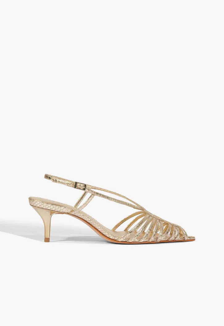 Com um visual clássico e elegante, esse scarpin dourado é daqueles modelos que deixam o look mais sofisticado na hora! Com salto fino médio, fechamento com delicada fivela e gáspea com multi tiras fininhas, esse scarpin de couro tem ainda um estilo retrô glam que deixa o look ainda mais especial!