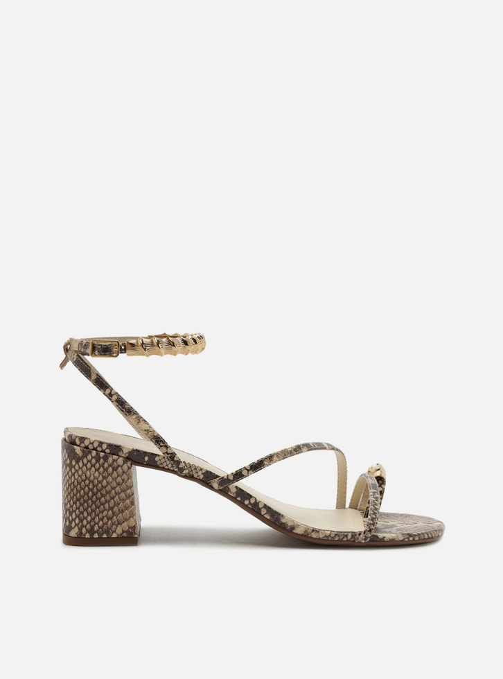 Sandália feminina cinza com estampa e textura snake. O sapato tem salto médio bloco e formato quadrado na ponta. Possui tira fina que cruza a parte superior do pé em diagonal, além de tira dedeira com aplicação de metais dourados. Traz tiras finas que saem das laterais, cruzam no calcanhar, contornam o tornozelo e fecham em fivela lateral, também com aplicação de metais dourados. Com palmilha off-white e inscrição do nome da marca.