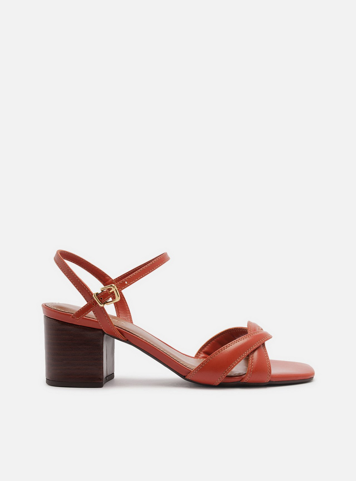 Sandália feminina marrom alaranjada de couro. O sapato tem salto médio bloco em fachete e formato quadrado na ponta. Traz tiras cruzadas em enlace sobre os dedos. Possui tira fina no calcanhar e tira no tornozelo que fecha em fivela lateral. Com palmilha bege e inscrição do nome da marca.