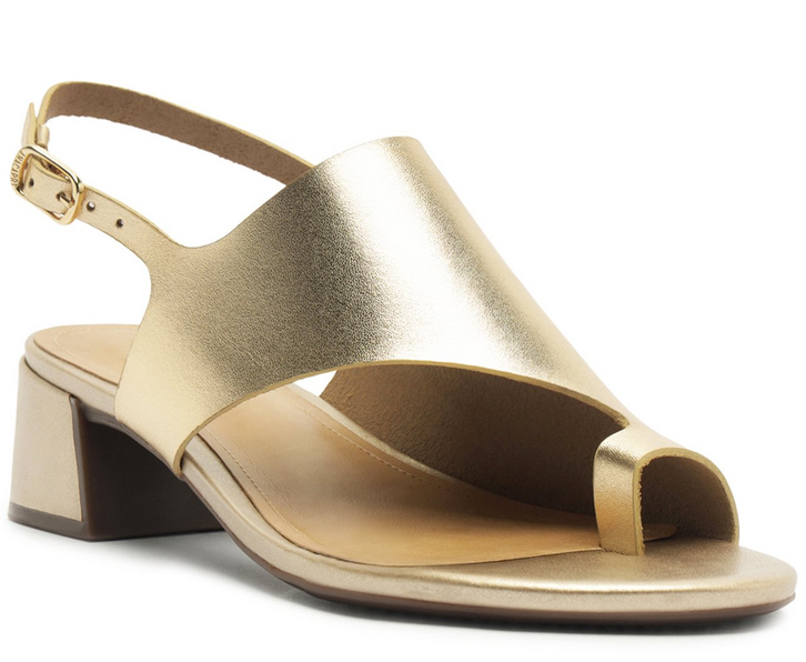 Sandália de salto bloco e tira assimétrica em couro, na cor dourada. O modelo possui salto em bloco baixo e apresenta cabedal em tira única assimétrica mais larga - de material similar ao couro, com efeito envernizado. Possui um design imponente de recorte que cobre parte do pé e detalhe que separa o dedão dos demais dedos, com tiras que seguem contornando o calcanhar, presa por uma das laterais, com fecho afivelado lateral. De biqueira moderna quadrada, traz palmilha comfy e assinatura Anacapri em carimbo metálico.
